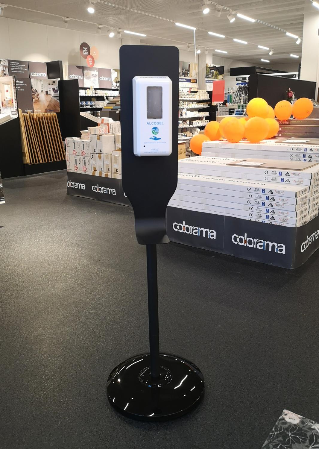- För att minimera kontaminering av bakterier och virus, så kan vi varmt rekommendera denna stolpe med den robusta och beröringsfria dispensern för Alk-IZ, alkogel.