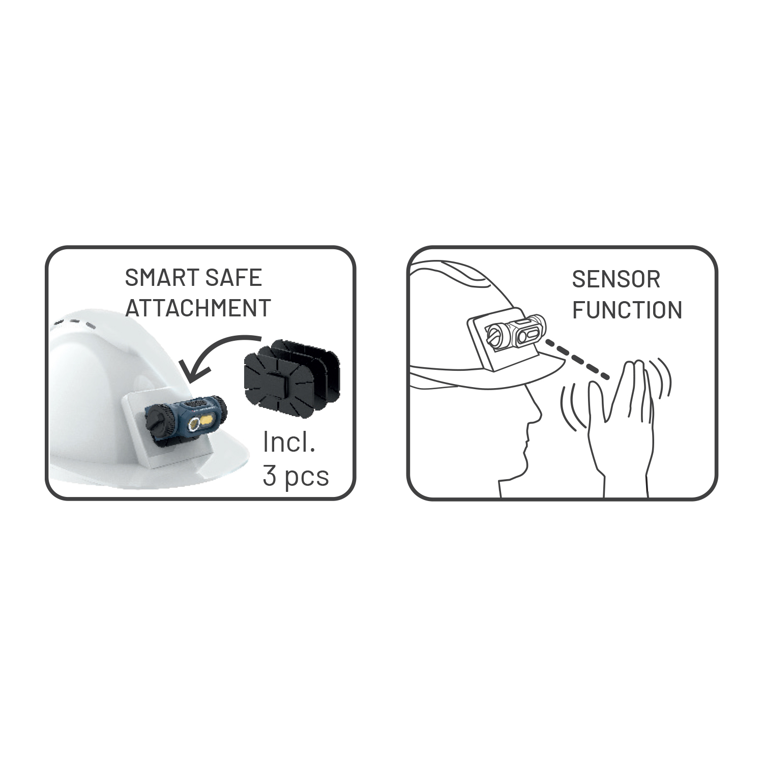 Arbetslampan fästs enkelt på din skyddshjälm med SMART SAFE ATTACHMENT-funktionen, med hjälp av de medföljande självhäftande monteringsbaserna. Med sin eleganta och kompakta design fungerar HORIZON-lampan som ett mångsidigt belysningsalternativ som passar perfekt på alla typer av skyddshjälmar.
