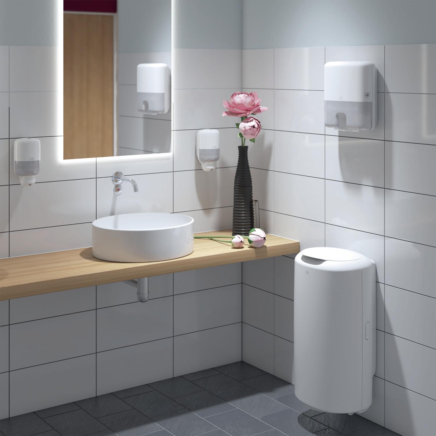 Tork Dispenser Mid-size Twin Toalettpapper i Elevation design passar perfekt för toalettutrymmen med medelhög till hög besöksfrekvens.